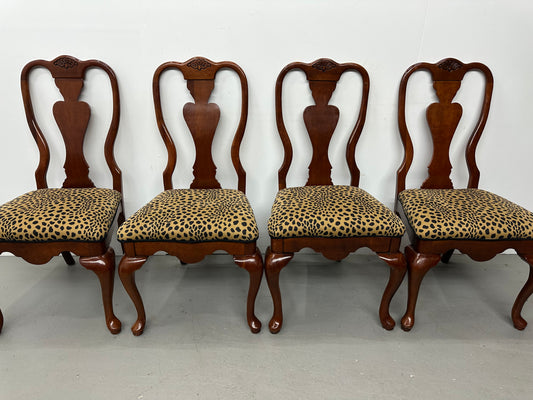 Set of 6 Queen Anne Style Solid Engraved Wood Splat Back Leopard Print Dining Chairs