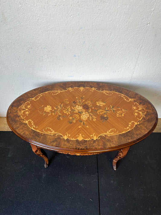 Antique Burled Walnut Marquetry Coffee Table Inlaid and Lacquered Oval #0432